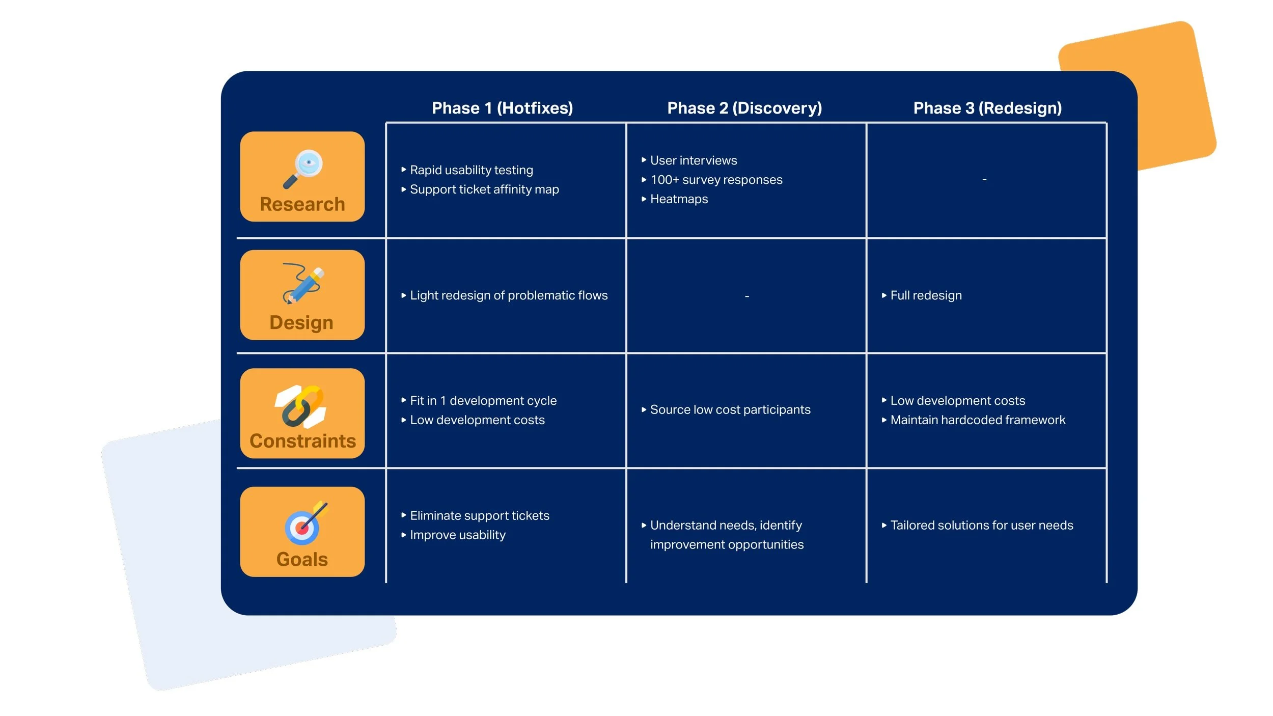 Implement hotfixes now to retain users, make space on the product roadmap for a navigation and full feature redesign