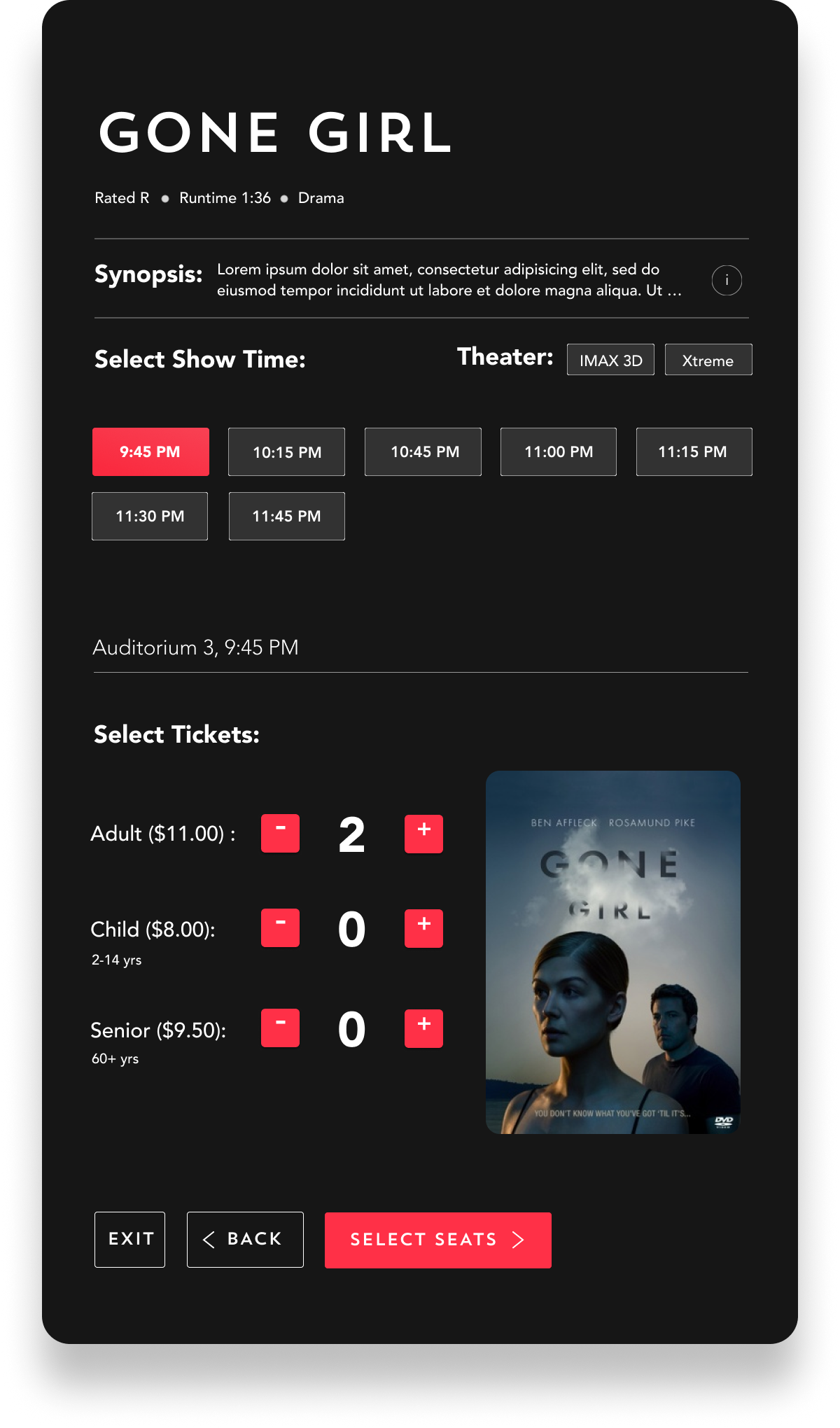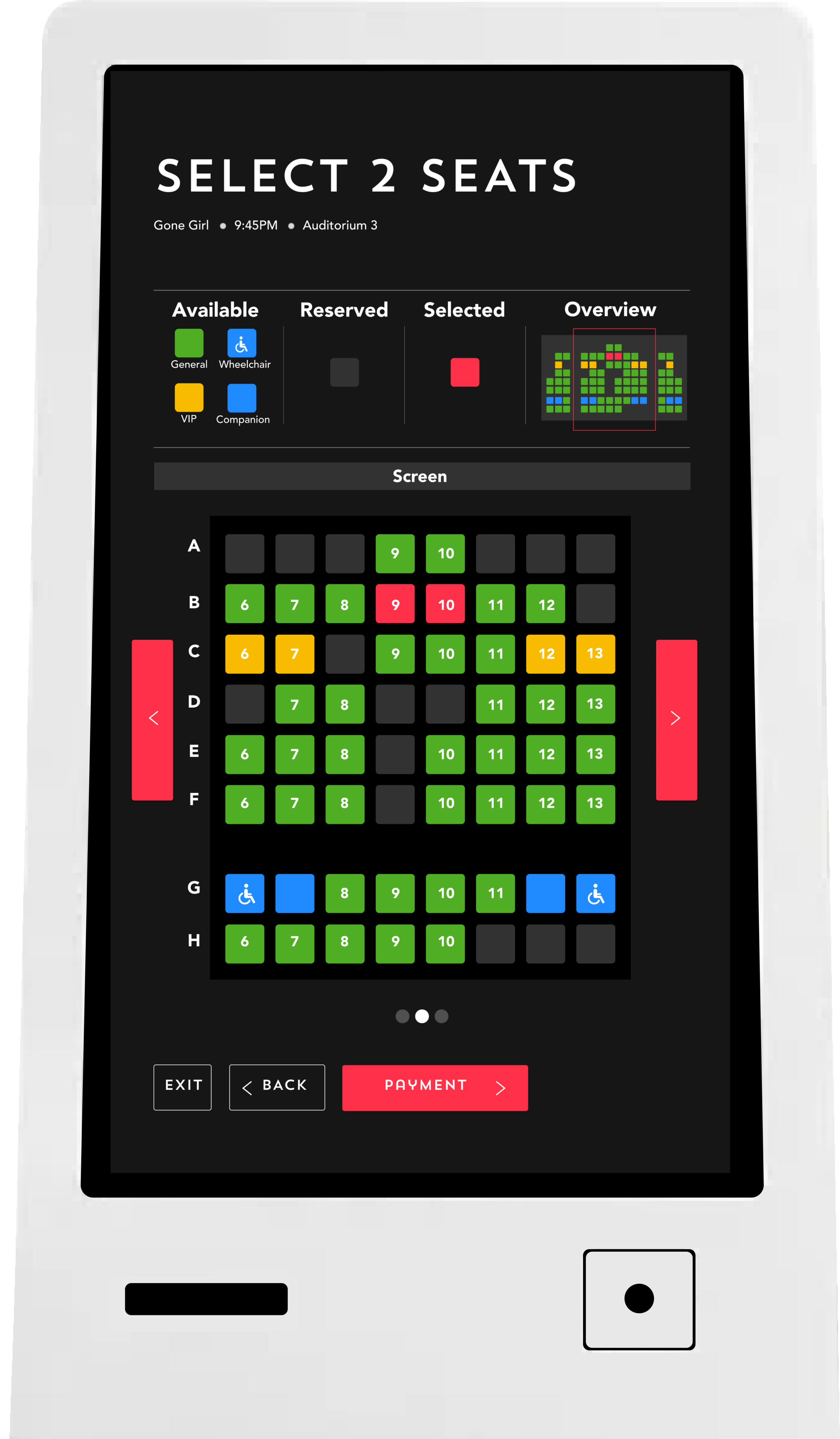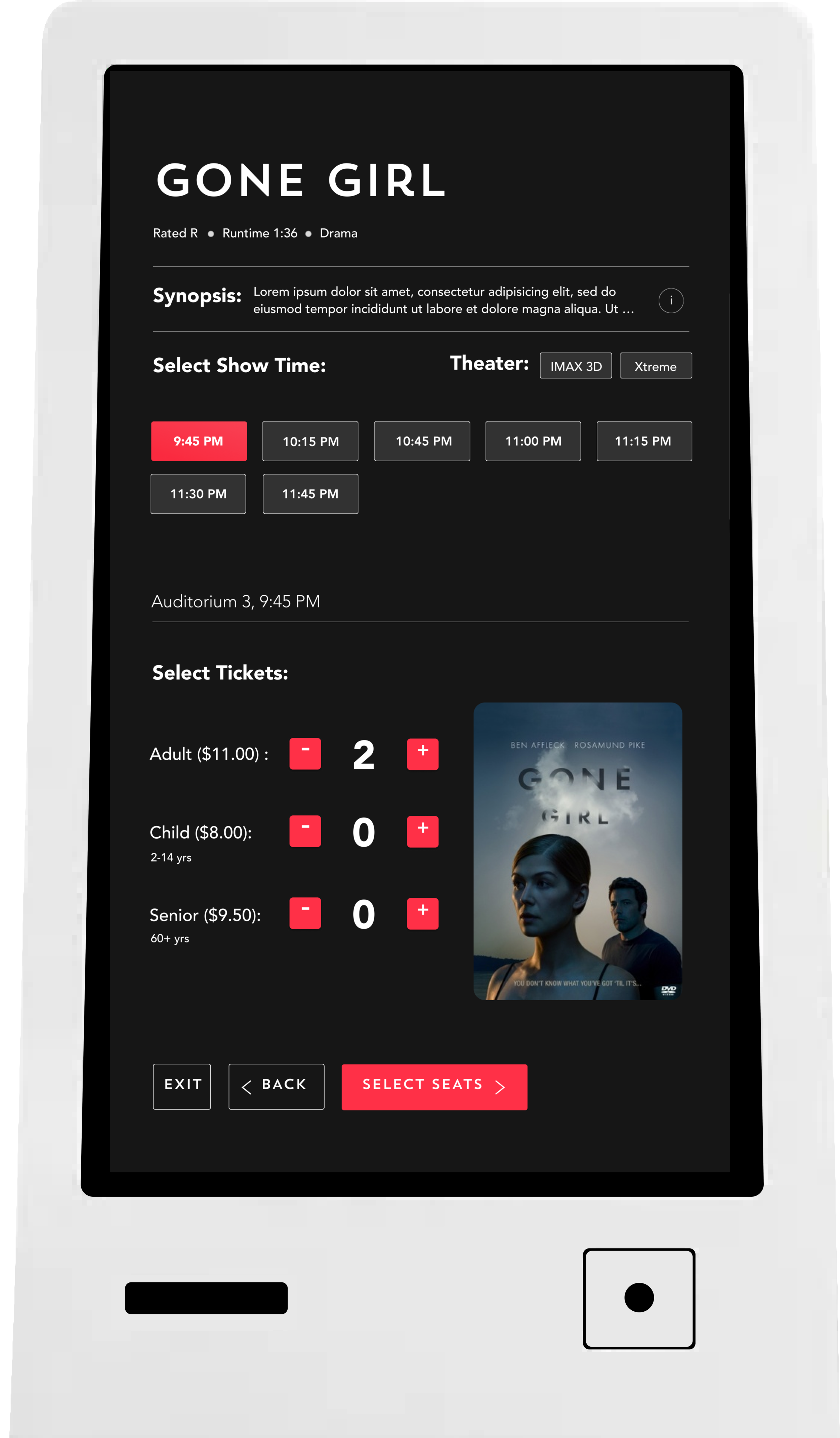 Retriever POS is a movie theater kiosk system used in over 50 theater locations nationwide, catering to small and mid size movie theater chains. Despite their success, the interface had not been revamped in a long time. I was hired on to a) create new user flows with the look & feel of their new website’s mock-ups and b) present an entirely unique design. This design accounted for multiple screen sizes, including horizontal alignments.